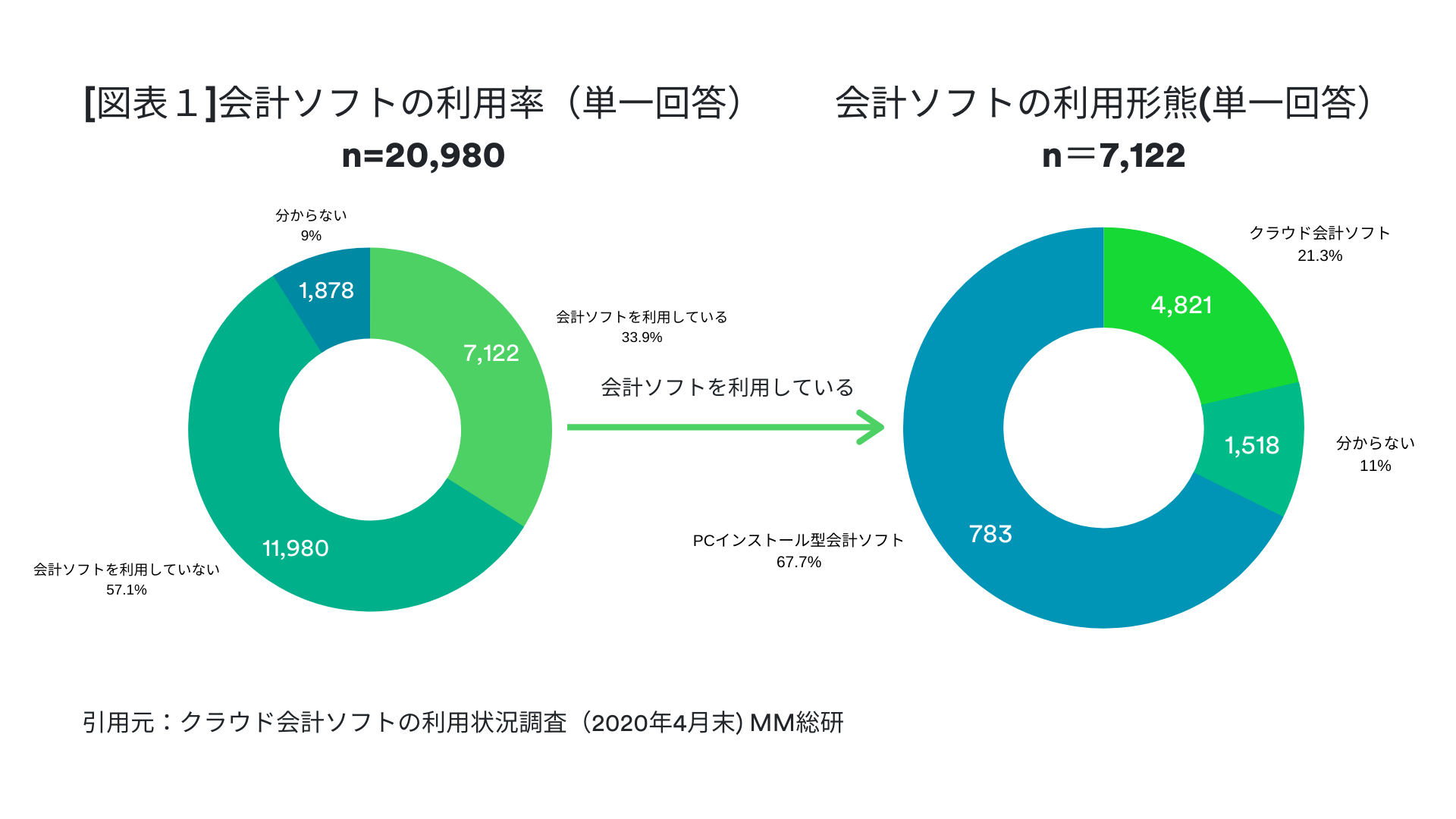 2020年4月末にMM総研が発表した調査によると、2019年の確定申告を終えた個人事業主(20,980事業者)のうち、会計ソフトを利用している個人事業主は全体の33.9%を占め、その内インターネット経由で会計ソフトの機能を利用するクラウド会計ソフトの利用率は21.3%とはじめて20%の大台を突破しました。