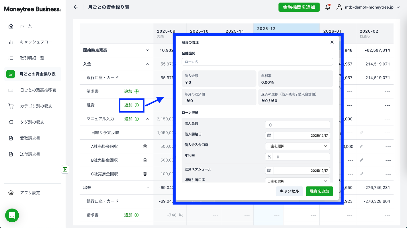 月次資金繰り表に、融資の登録・管理機能が追加されました。